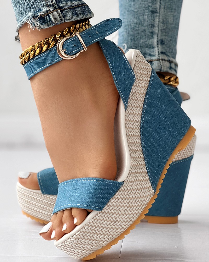 Ankle Strap Peep Toe Platform Denim Wedge Sandals
